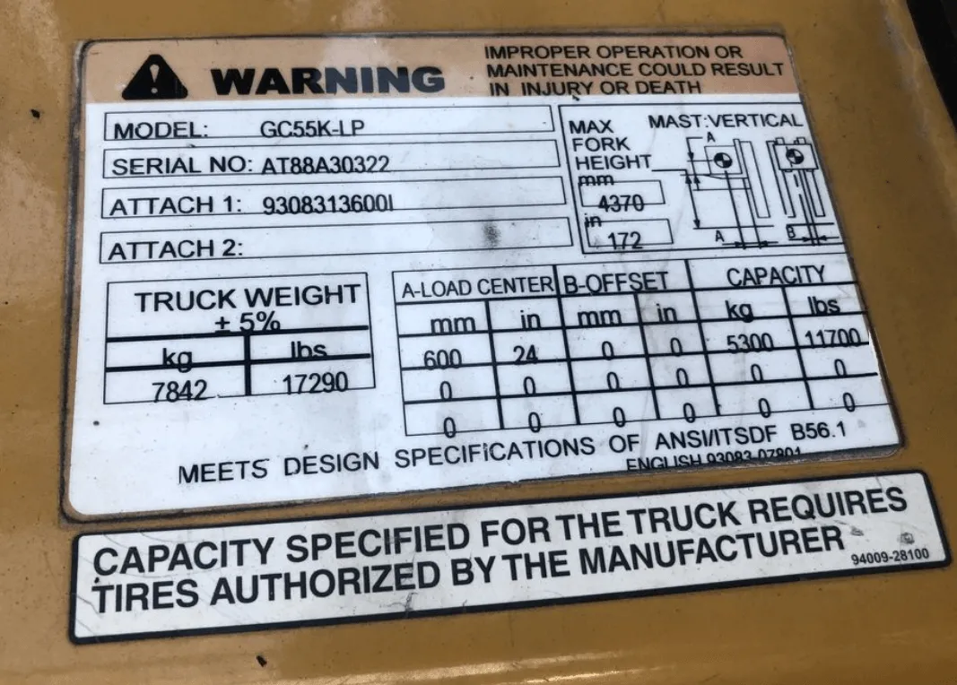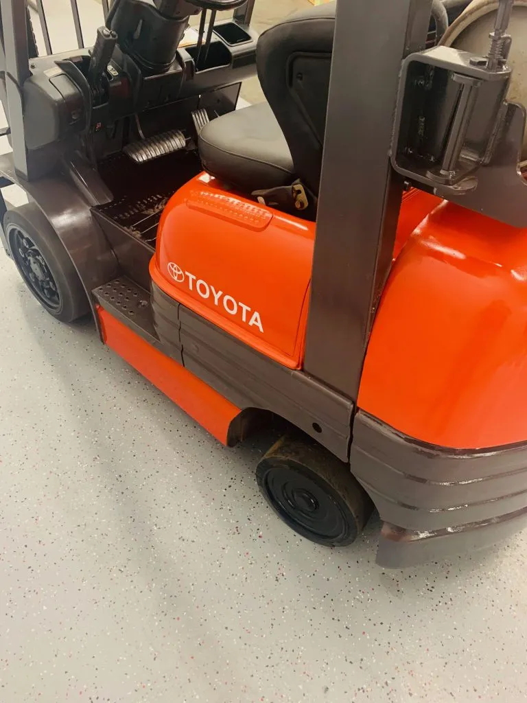 1999 Toyota 7FGCU25 Type: Propane Forklift Hours : 7280 Capacity : 5,000 lbs. Mast Height Min. / Max. : 82” / 132” Side Shift : Yes # of Valves: 2 Fork Length : 42″ Tires : 75% – New. Brakes: Good Oil or Hydraulic Leaks: No Leak Seat: Good or Reupholstered Paint : New Paint.