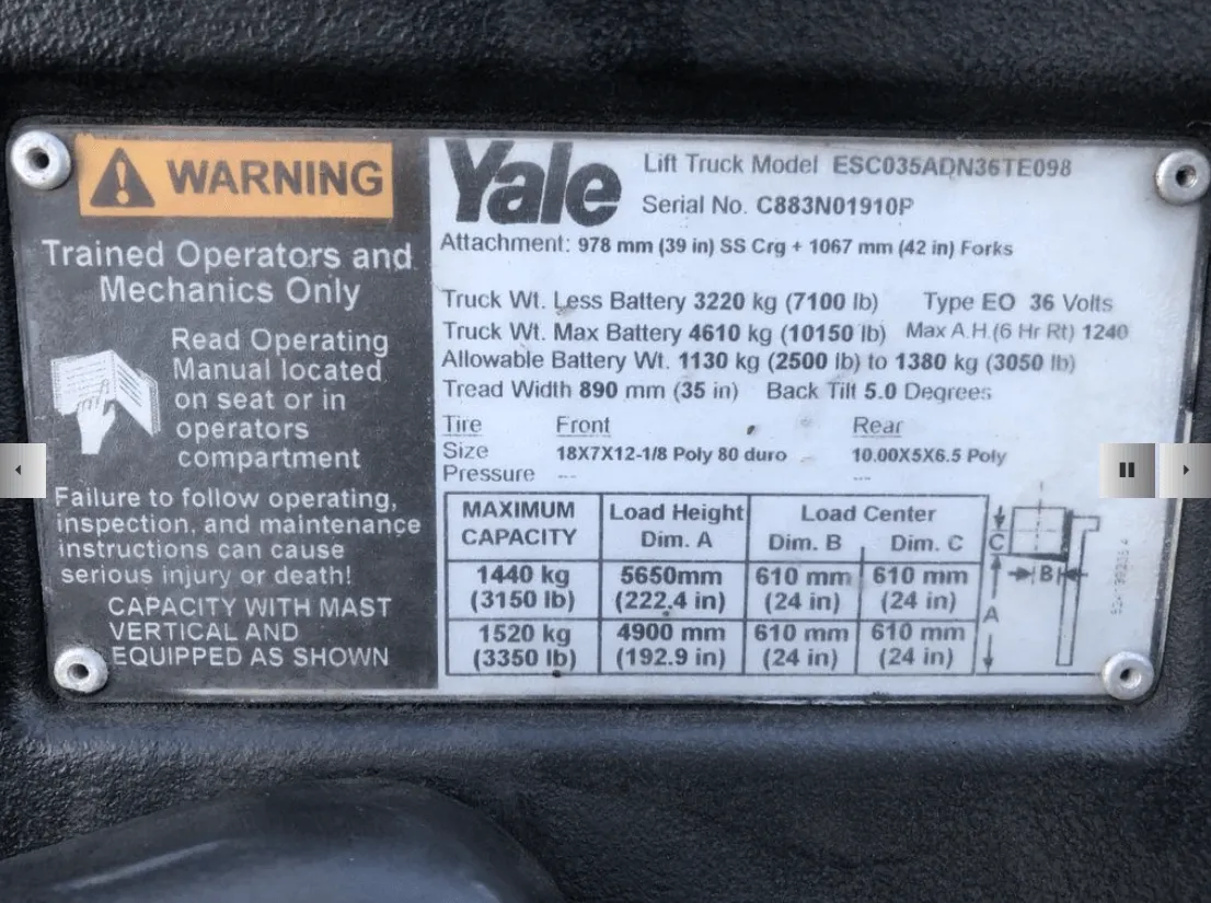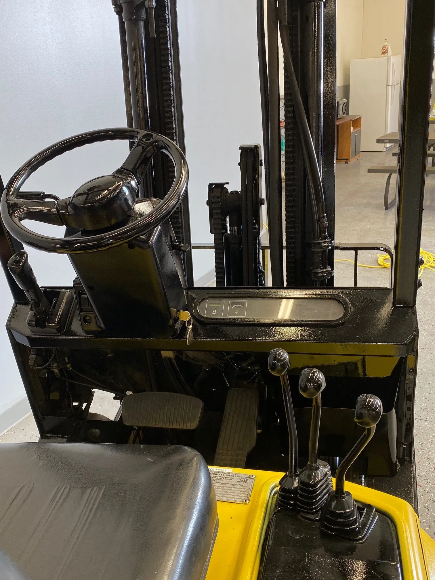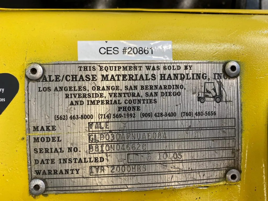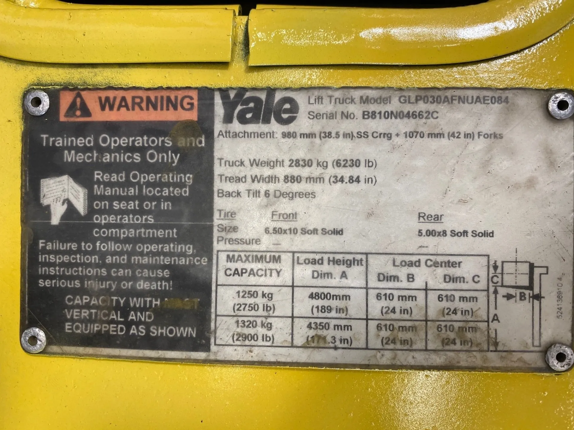 Yale GLP030 SN #B810N04662C Capacity: 3,000 lbs. Hours: 8286 Mast Lowered / Max Height: 83”/189” Fork Length: 48″ Side Shift: Yes Tires: Pneumatic 60% Brakes: Good Oil or Hydraulic Leaks: No Leaks Seat:
