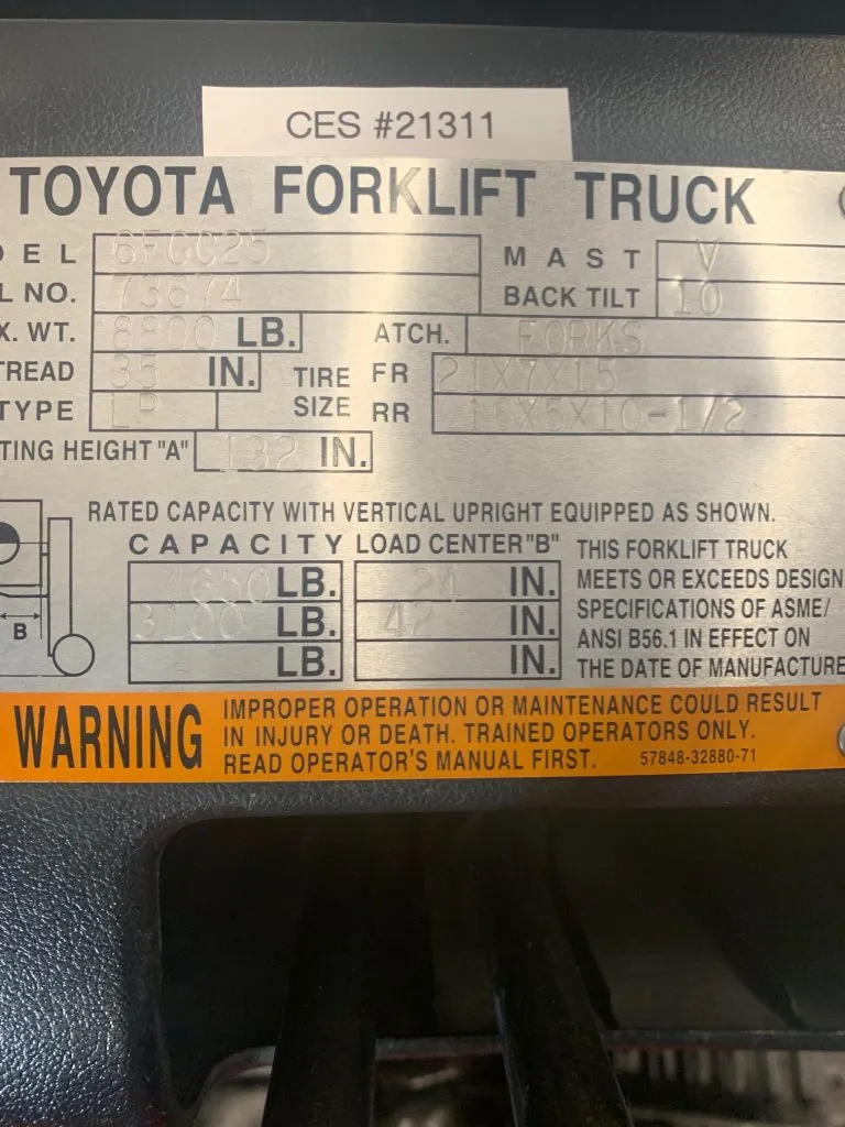 Toyota 6FGCU25 Propane Forklift. This used Toyota Propane forklift has been reconditioned and is ready to go to work and it has 2 stage mast. This used Propane Forklift has a great reconditioned battery and comes with a one year battery warranty.